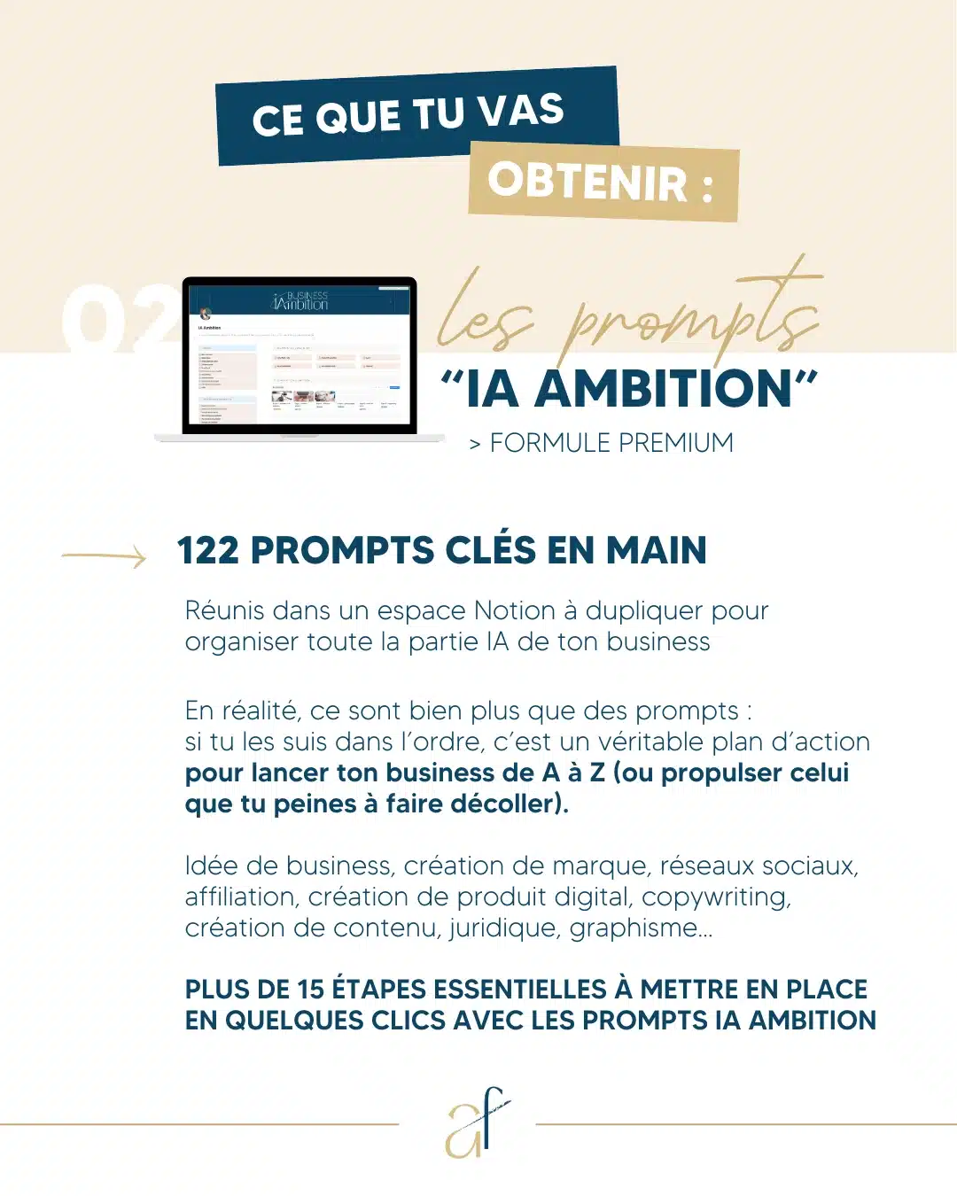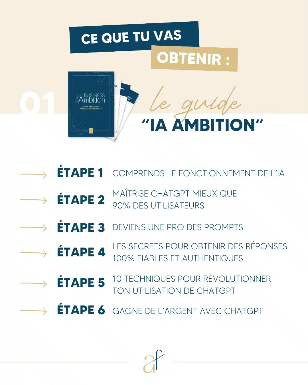 Les prompts IA Ambition te guide pour lancer ton business en partant de zéro, donc sans audience existante. Et dans le plan d’action, il y a toute une partie sur la stratégie Instagram, pour t’aider à créer ta communauté : ta description de profil, ton avatar, les idées de post, la création de visuels, la rédaction des descriptions, les hashtags, les stories, les accroches virales...etc. Tu as juste à copier coller les prompts et te laisser guider. Je te parle d’Instagram, mais on voit aussi comment adapter ta stratégie sur les autres réseaux sociaux, ainsi que YouTube, le Podcast, l’emailing…