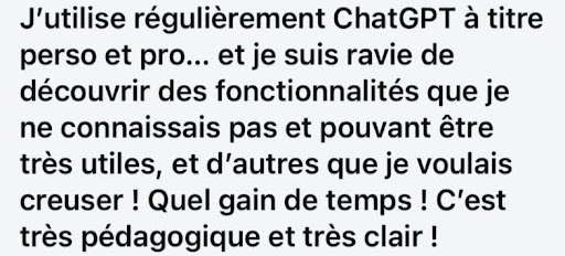En résumé : tu apprends à manier l’outil, à parler son langage, et à obtenir enfin des réponses qui te ressemblent. Parfait si tu veux te familiariser avec l’intelligence artificielle ou gagner du temps dans ton quotidien et ton business.