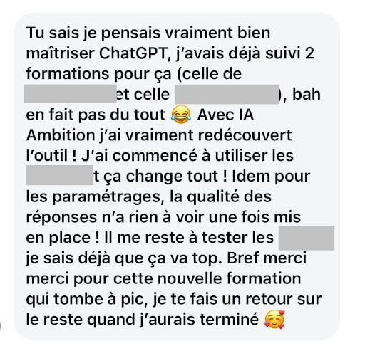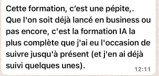 J’ai évidemment utilisé ChatGPT pour aller plus vite sur certaines tâches, à illustrer certains propos…etc. Mais le programme Business IA Ambition est exclusivement basé sur mes connaissances et mon expérience, j’ai travaillé sur ce programme pendant 3 mois afin de proposer un programme complet, concret et avec une réelle valeur ajoutée.